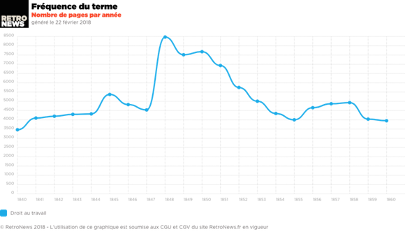 Alors que le nombre de journaux explose durant le printemps 1848, initiant une multitude de débats et de polémiques, le thème du droit au travail se retrouve en effet fréquemment dans les colonnes de la presse qui y voit le symbole des aspirations socialistes. L’emploi de cette formule s’accroît ainsi dès 1847 avant de culminer en 1848 puis de décliner pour presque disparaître au fur et à mesure de l’effondrement des espérances révolutionnaires et de la montée de la répression qui aboutit avec le coup d’État de décembre 1851 de Louis-Napoléon Bonaparte, futur Napoléon III.